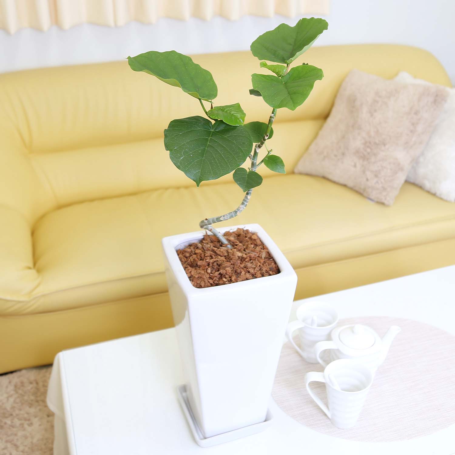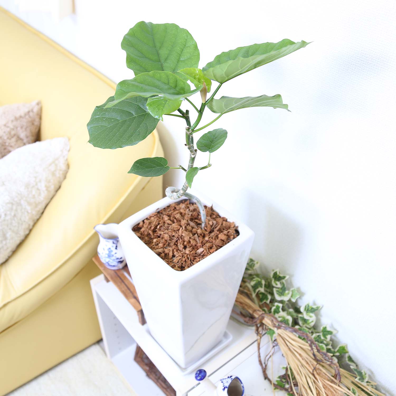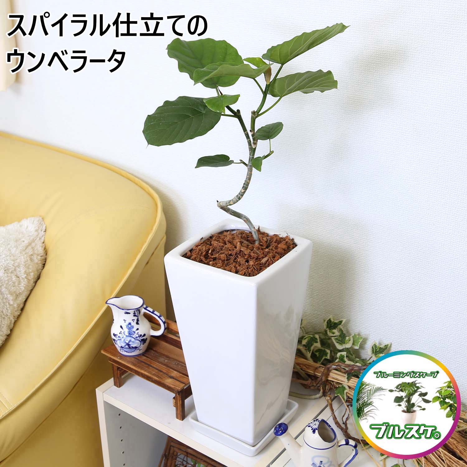 スパイラル仕立てのウンベラータ 7号 ホワイトスクエア陶器鉢 ストレート+陶器製お皿付き 土の表面:ウッドチップ|観葉植物 ブルーミングスケープ