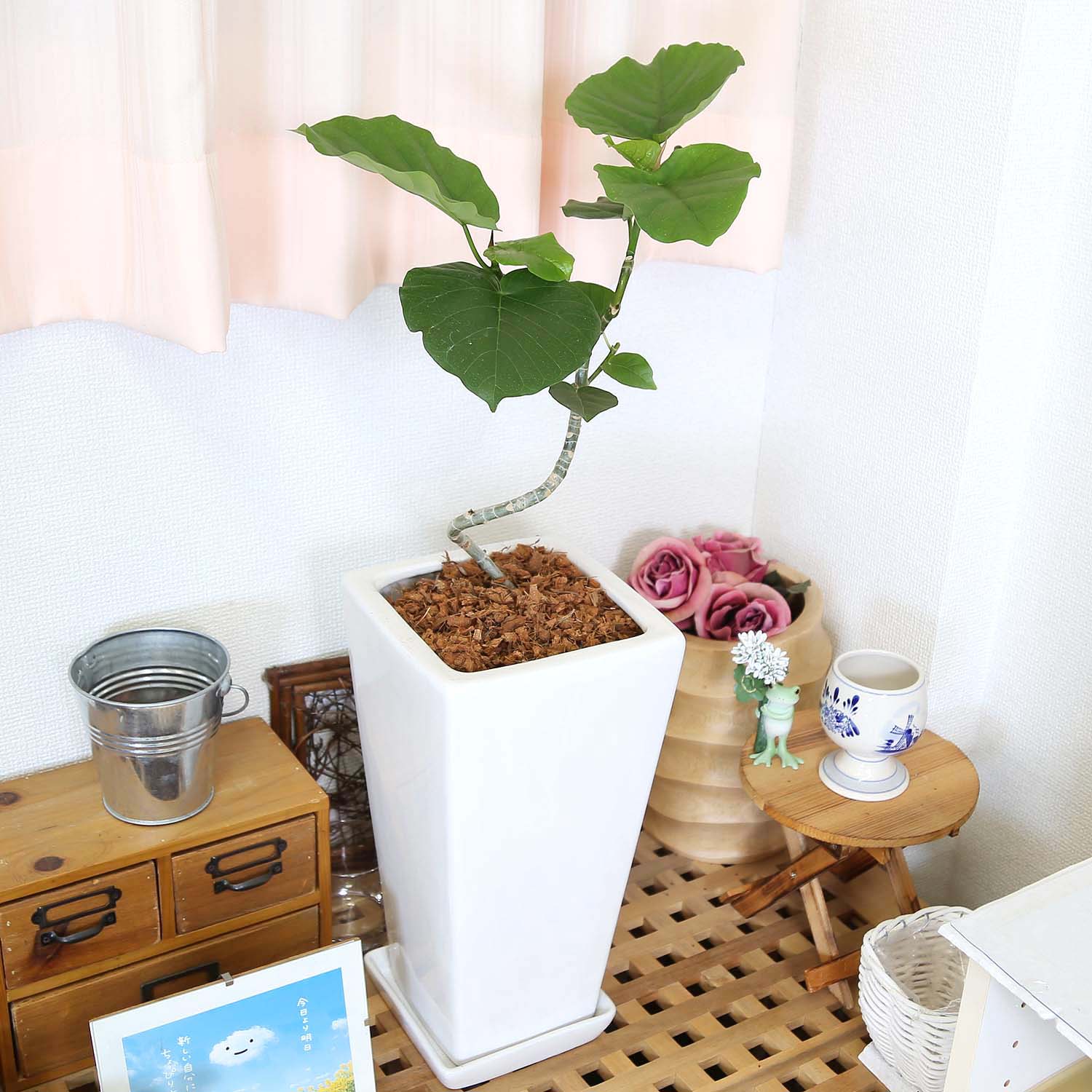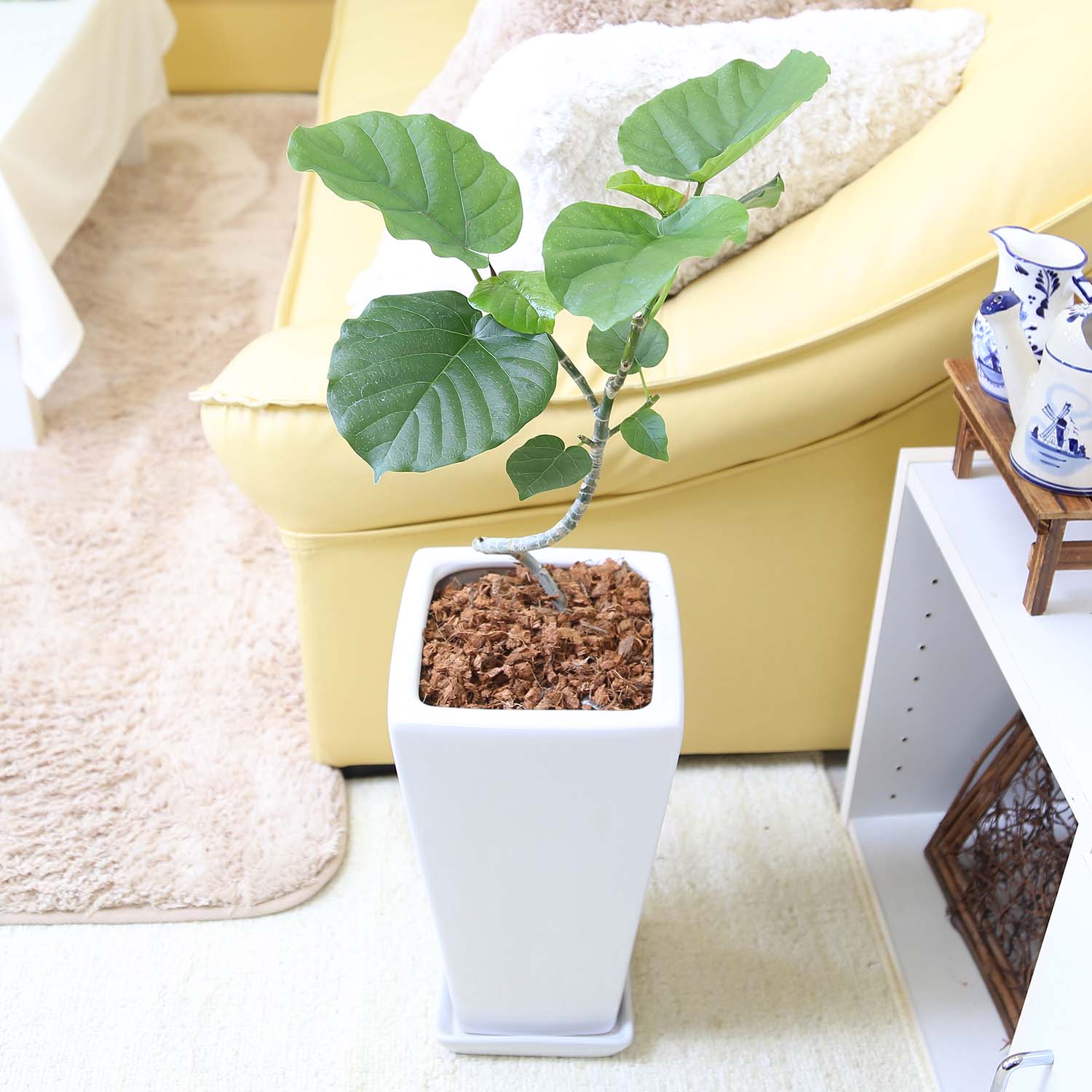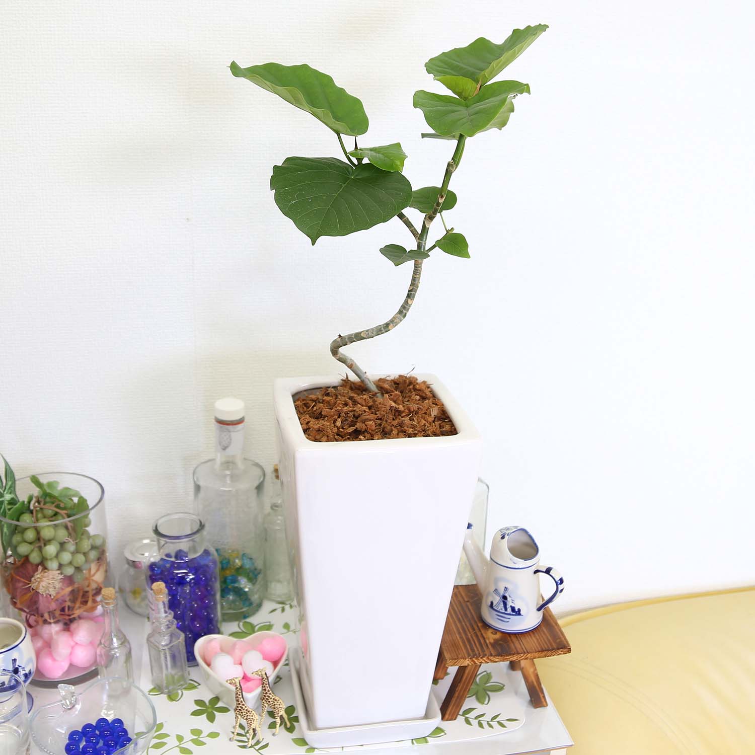 スパイラル仕立てのウンベラータ 7号 ホワイトスクエア陶器鉢 ストレート+陶器製お皿付き 土の表面:ウッドチップ|観葉植物 ブルーミングスケープ