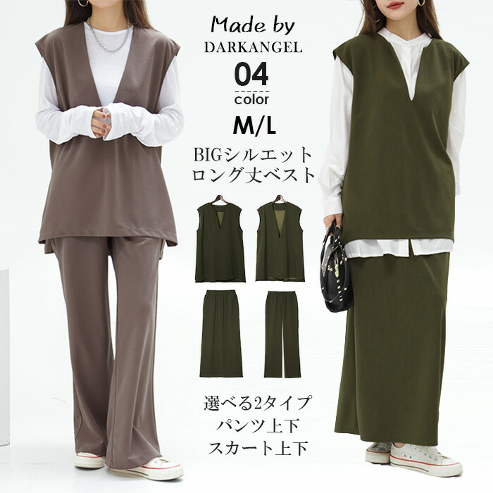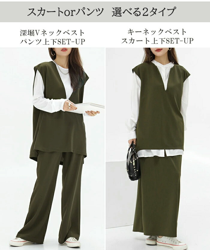 セットアップ レディース 春 40代 カジュアル きれいめ ジレ Vネック スキッパー 大きいサイズ 2点セット 上下セット ゆったり オーバーサイズ ベスト ナロースカート ワイドパンツ タイトスカート【ジレセットアップ2タイプ】