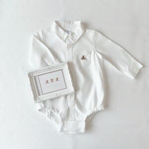 𓆸 ボディスーツ オリジナル写真2枚あります📸ˊ˗ くまの刺繍がかわいいシャツロンパース🧸🤎 普段使い・ハーフバースデーや結婚式に 参加した時に蝶ネクタイを付けて着用しました⟡.·