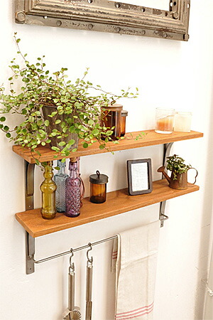 チーク材の棚板とRusticアイアンのパーフェクトな組合わせのウォールシェルフ。サニタリーからキッチン、お部屋のディスプレイ用にと色々な用途にご使用できる、ユーティリティーなアイテム。 サニタリーでは鏡の下にピッタリです。 幅が50cmあるので沢山の洗面用品や化粧品など可愛く収納できそう。 キッチンではスパイスラックなどに大活躍! バーとSフックまで付いているので、キッチンタオルを 掛けたり、ツールを掛けたりと大変便利にできています。