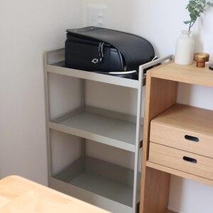 裏返せば背面のパネルで中身を隠せる、食品や生活雑貨、学用品などを収納できる目隠しワゴン。引き出しやすいキャスター付きで棚板は高さ調節が可能。