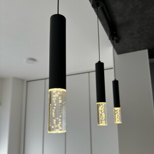 【我が家のライト💡】細身デザインがすっきり🫧 キッチンの照明を探してて、 この細長いペンダントライトに一目惚れ シンプルだけど存在感があって、 気泡のデザインがお気に入り💟 夜つけると思ったより明るくて お部屋を暖かい雰囲気にしてくれる! モノトーンインテリアにも馴染むデザイン◎