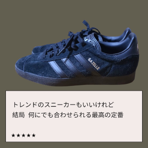 アディダスの名作《ガゼル》。 ブラックの王道カラーで、とにかく使いやすい万能スニーカー。 シンプルなのに存在感があって、キレイめにもカジュアルにもスッと馴染むデザイン。 ユニセックスだからサイズ展開も豊富で、ペア使いにも◎ 1足持っておくと「今日はこれでいいや」じゃなく「これが履きたい!」になる定番です✨