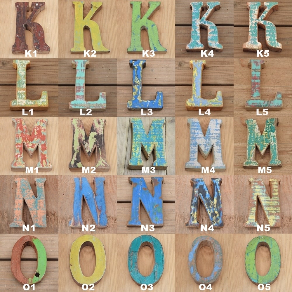 木製 アルファベット 切り文字 オブジェ 『KLMNO』 高さ18cm ボート再生家具 イニシャル インテリア 無垢材 古材 リサイクルウッド リユース木材 業販 卸 DIY パーツ スーパーセール