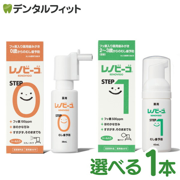 レノビーゴ STEP0 1本(38mL)フッ素100ppm(0歳から) / レノビーゴ STEP1 1本(40mL)(フッ素500ppm おやつの食べ始め 2〜3歳ごろから) むし歯 発生進行予防 乳幼児からのむし歯予防