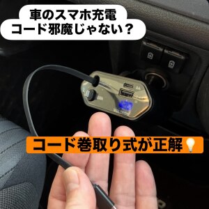 車で充電する時、コードがびろ〜んって垂れ下がって邪魔じゃない? コードびろ〜ん問題はこれで解決👍‼️ 巻取り式のコードだから長さ調整できるし、使っていない時はスッキリしまえて邪魔にならない🤗 コードが2本あるのもめちゃ使えて便利です🥰