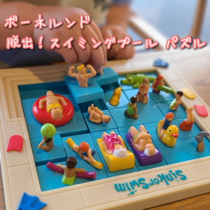 🌼【ボーネルンド 脱出!スイミングプール🧩】 🍀ルールは至ってシンプル!浮き輪に乗った男の子をプールサイドに連れていくだけ! 🍀難易度は5段階用意されており、難しいものは大人も悩むほどです😖 🍀小さい子はただピースをはめるだけでも楽しめます😊 独特な世界観でただ置いてあるだけでもインテリアの一部になります❤️