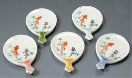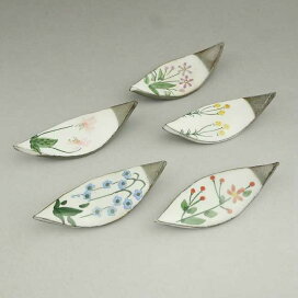 目にも涼しげな清水焼の窯元 芳山の夏草花の描かれた団扇の箸置きセットです。団扇の形をした箸置き、アジサイ、朝顔、露草、鉄線、桔梗の五つ。夏らしい草花が描かれています。