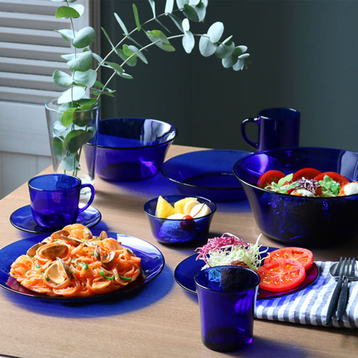 深みのあるサファイアカラーは、ガラスの原料に色を調合しているので、いつまでも美しさを保ちます。