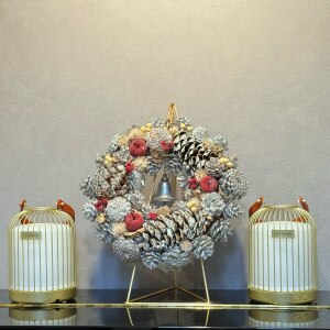 存在感がある大きめサイズのクリスマスリース✨ ナチュラルで飽きのこないデザインですね🩷 赤やゴールド・シルバーのリボンをちょこっと付けても 雰囲気変わって毎年楽しめそうです🫶