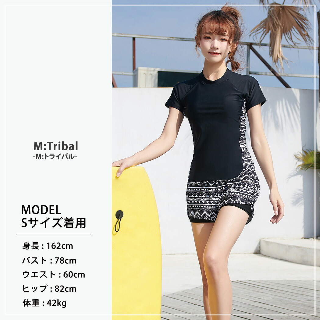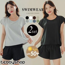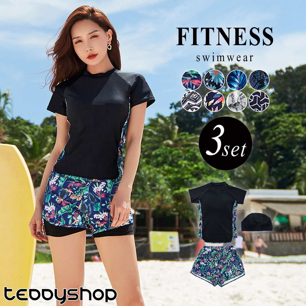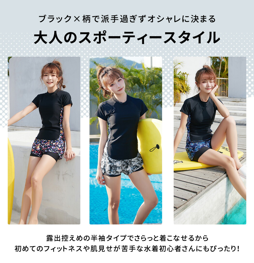 フィットネス水着 レディース セパレート 体型カバー水着 ママ水着 大きいサイズ おしゃれ かわいい 女性用 レイヤード風 ショートパンツ 水泳帽 ラッシュガード 3点 上下セット 無地 小胸 盛れる 黒 20代 30代 40代 50代 60代 ぽっちゃり 露出控えめ