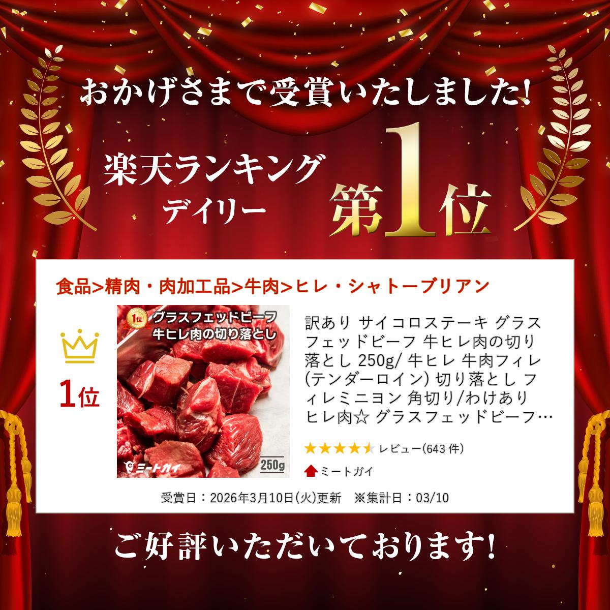 訳あり サイコロステーキ グラスフェッドビーフ 牛ヒレ肉の切り落とし 250g/ 牛ヒレ 牛肉フィレ (テンダーロイン) 切り落とし フィレミニヨン 角切り/わけあり ヒレ肉☆ グラスフェッドビーフ(牧草飼育牛肉・牧草肉) -B105a