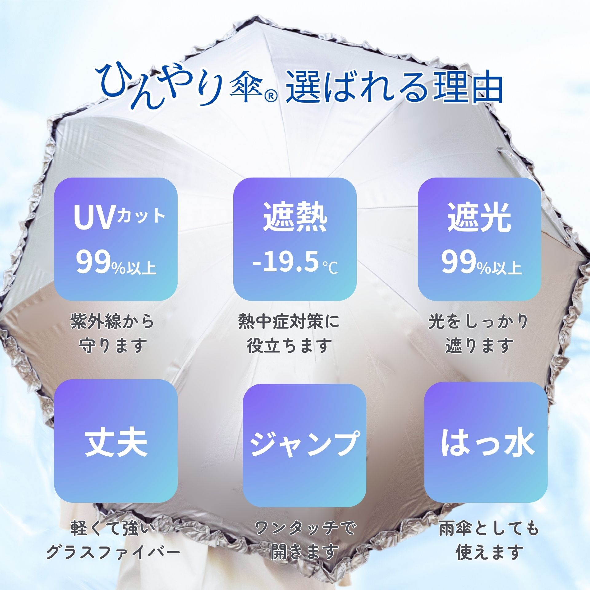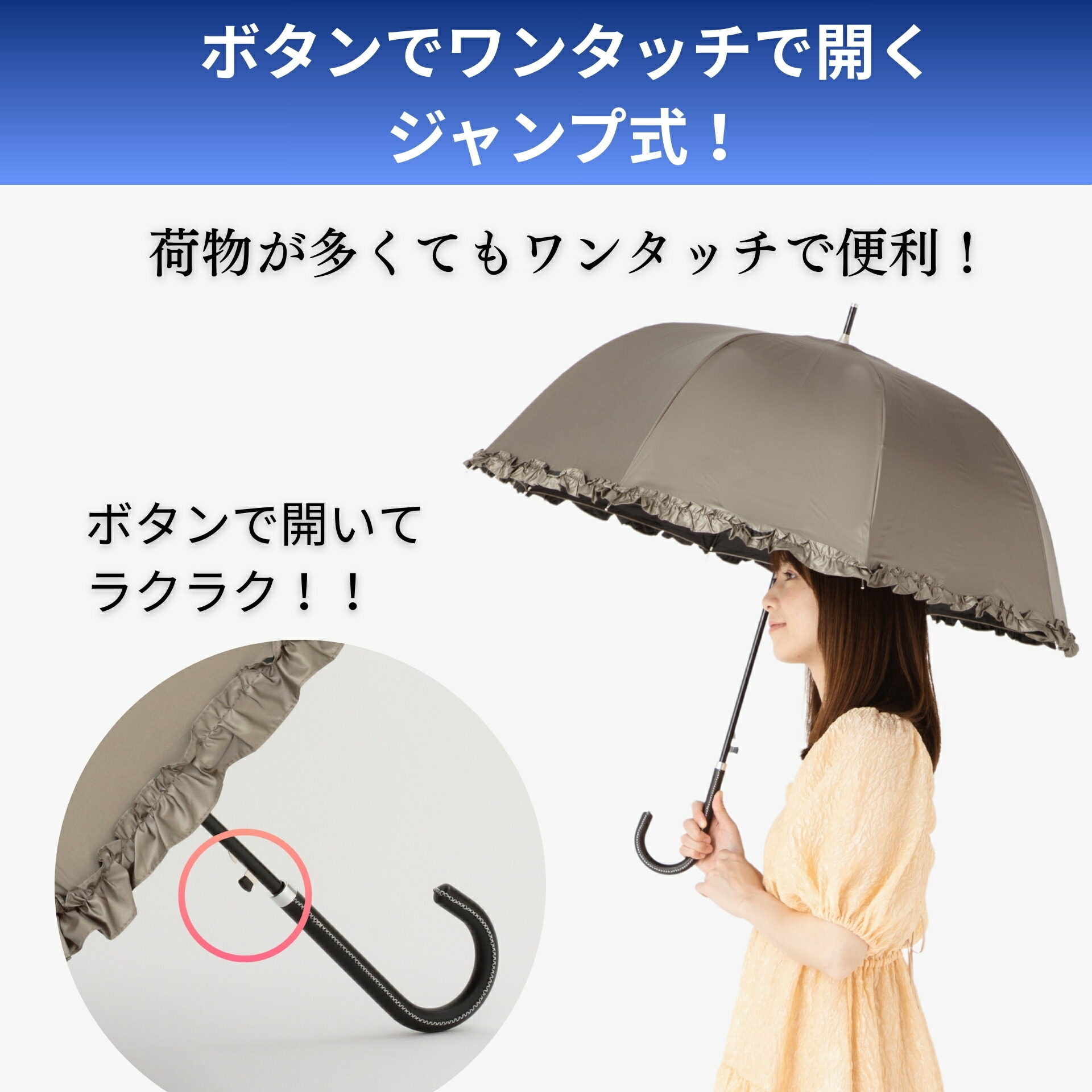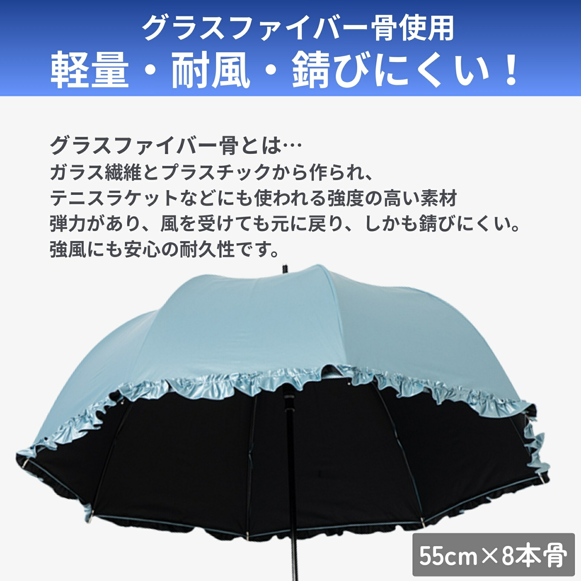 日傘 長傘 晴雨兼用 レディース 55cm フリル ドーム型 遮熱 遮光率99%以上 UVカット率99% UPF50+ 焼かない 紫外線対策 熱中症対策 通勤 通学 おしゃれ かわいい 上品 デザイン おすすめ 人気 丈夫 深張り ワンタッチ ジャンプ傘 シルバー 涼しい ひんやり傘 リーベン 1415