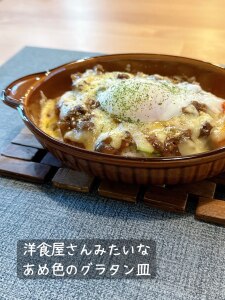 あめ色がかわいい🤎 日本製の耐熱グラタン皿🥄 大きさや深さがちょうどいい✨ 持つところもあるので運びやすいです😊 お料理がおしゃれに見えて 気分も上がります🤎