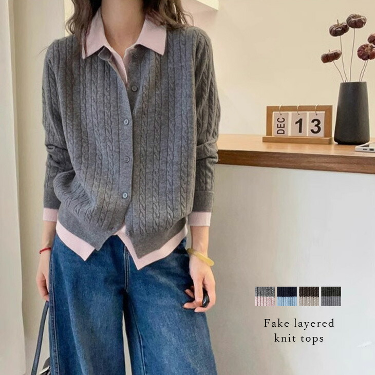 【ニットカーディガン✨レイヤード風】 ブラウスとニットを重ね着したように見える✨ 着るだけでトレンドのバイカラー✨ ニットは柔らかな肌触りで着心地も✨ カーディガンだから、前を開けても閉めても✨ 忙しい朝にもコーデに迷わない、主役級の優秀アイテム!