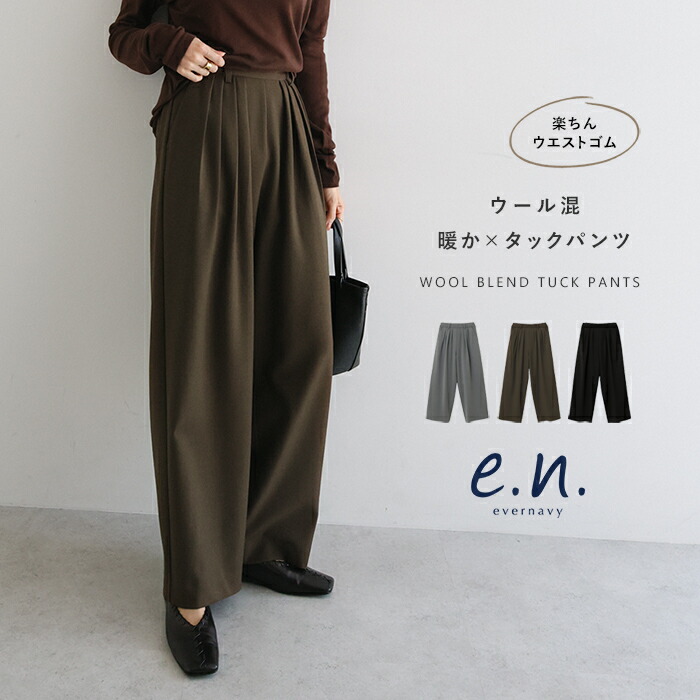 💠ワイドパンツ 秋冬にうれしい、ウール混のあったか素材。 上品シルエットなのに、ウエストゴムで楽ちんです◎