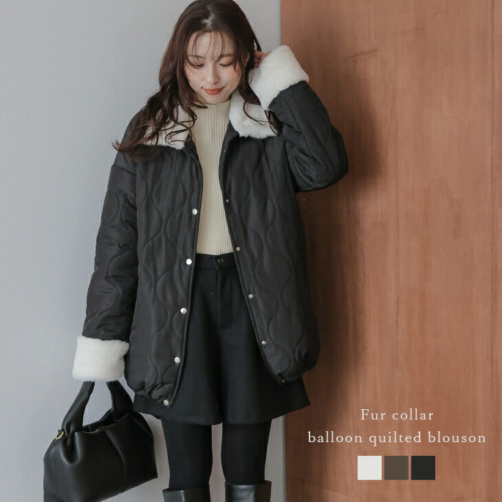 ブルゾン コート キルティング フェイクファー ドローコード バルーンシルエット スタンドネック ミドル丈 アウター フェミニン スナップボタン レディース 2025秋冬新作