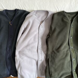 のススメ 昨シーズンに購入したカーキグリーンが、あまりにも着心地良く暖かい一枚だったので、今シーズンはグレーとチャコルグレーを大人買い。部屋着にも、外出にも、使い回せる優れ物。再資源化しやすいように生地やボタンなど単一素材で作られています。「素材に還る」いいキャッチですね。