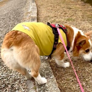 ワンニャンが元気になると話題の体温を保つ高機能素材🔥UNAGE アンエイジウェルネスウェア🔥無縫製で負担がかかりにくい🐾 こちらはアンエイジの最高峰ジュゲム💖 9キロ台細身コーギー女子。カナリヤXXL着用。 全身ショット、ご参考になれば幸いです🐾 コギ8歳🐶お手手治らないみたいです😢 骨の成長問題とのこと🦴 左のお手手は写真のように浮かせて過ごしています🐾 痛みはないみたいだけど歩けない(走れる)から 見ていると辛い😭 毎日すっごく頑張っています💪 何か少しでも彼女が快適になれば‥🌿 無理なくお散歩して楽しく過ごそうよね♪