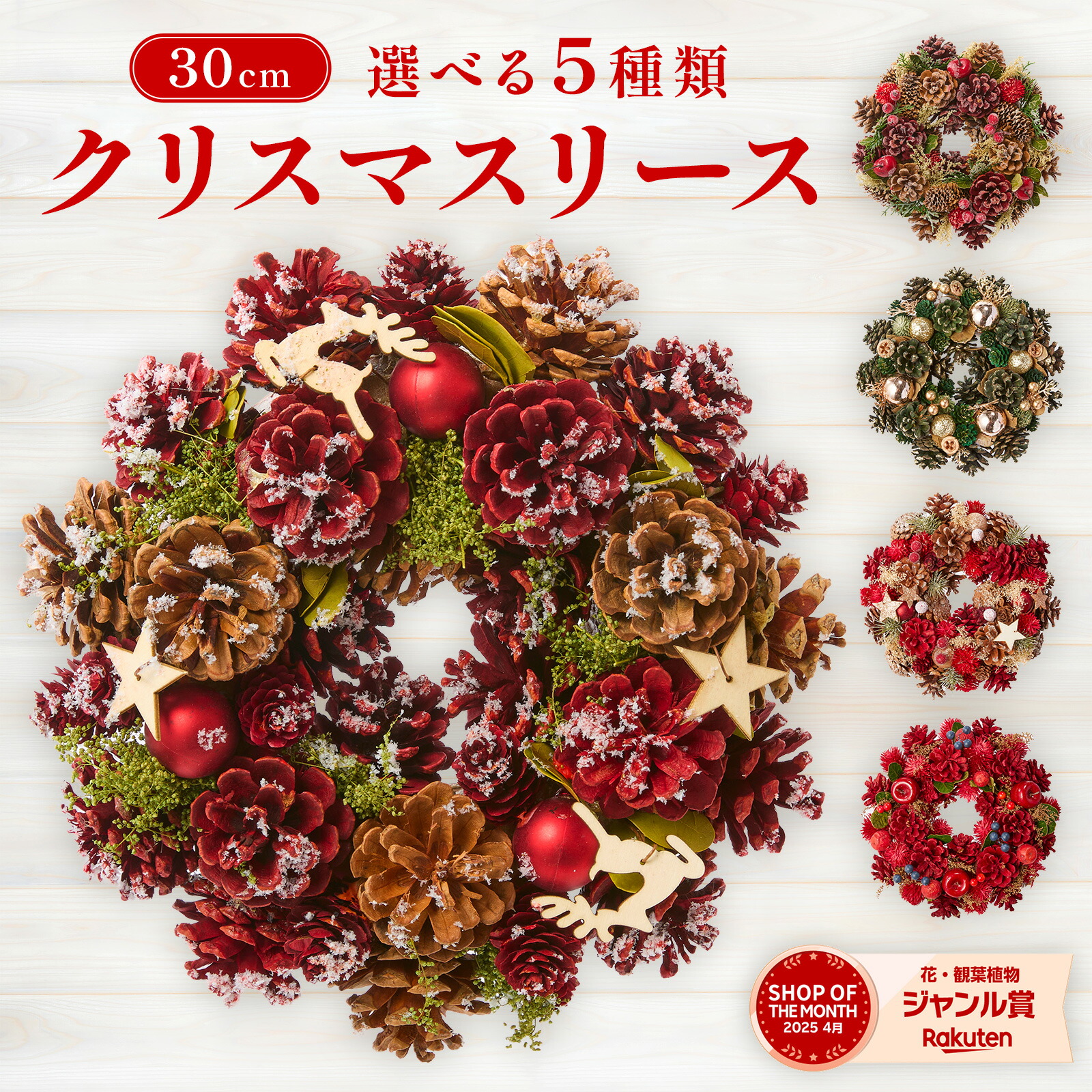 トラディショナルカラーによる王道デザイン。流行に左右されないクリスマスリース。ほんのり香りが残る杉のプリザーブドを使用。