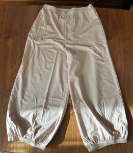 透ける素材でも使いやすいベージュを買ってみました 柔らかくて肌触りが最高で履いていてとても気持ちいいです ワイドパンツでトイレ行くのに便利です 思ったより短かく感じました 私は低身長なので脚の長い人はもっとそう感じると思います 足首側はすぼまっていても余裕があるので裾から少し冷気が入ってきます ふくらはぎがぴたっと締めつけがイヤな人やゴム跡が付くのが気になる人にはオススメです