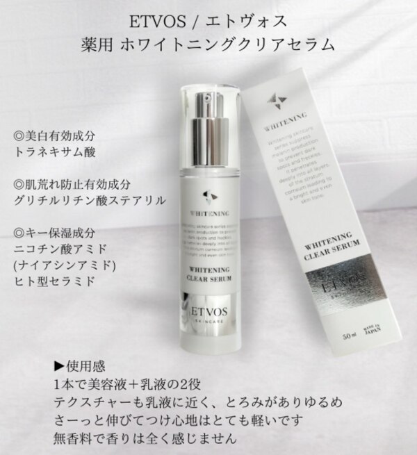【ETVOS公式】LDKのベスコス2024に選ばれました🏆敏感肌でもそうでなくても使ってほしい!美白と保湿の両方を叶えちゃいます! ETVOS / エトヴォス 薬用 ホワイトニングクリアセラムW ◎美白有効成分 トラネキサム酸 ◎肌荒れ防止有効成分 グリチルリチン酸ステアリル ◎キー保湿成分 ニコチン酸アミド (ナイアシンアミド) ヒト型セラミド ▶︎使用感 1本で美容液+乳液の2役 テクスチャーも乳液に近く、とろみがありゆるめ さーっと伸びてつけ心地はとても軽いです 無香料で香りは全く感じません 透明感あふれる美肌へ 今すぐ"楽天市場で詳細を見る"をタップ