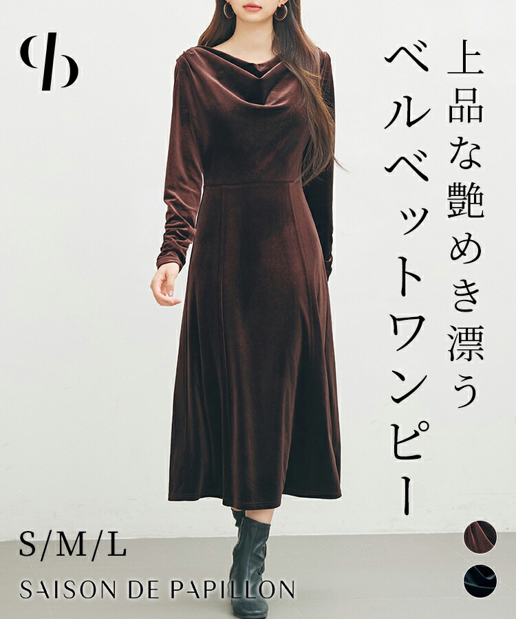 【一部予約】ワンピース ロングワンピース ベロアワンピース フレアワンピース 長袖 タイト ドレープドネック Uバック バックオープン カジュアルワンピース バックゴムSAISON DE PAPILLON sdp0337