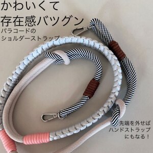 コーディネートのアクセントにもなる!パラコードをソロモン編みにした頑丈なスマートフォン用のショルダーストラップです。両先端はフック金具になっているので簡単に着脱できます。