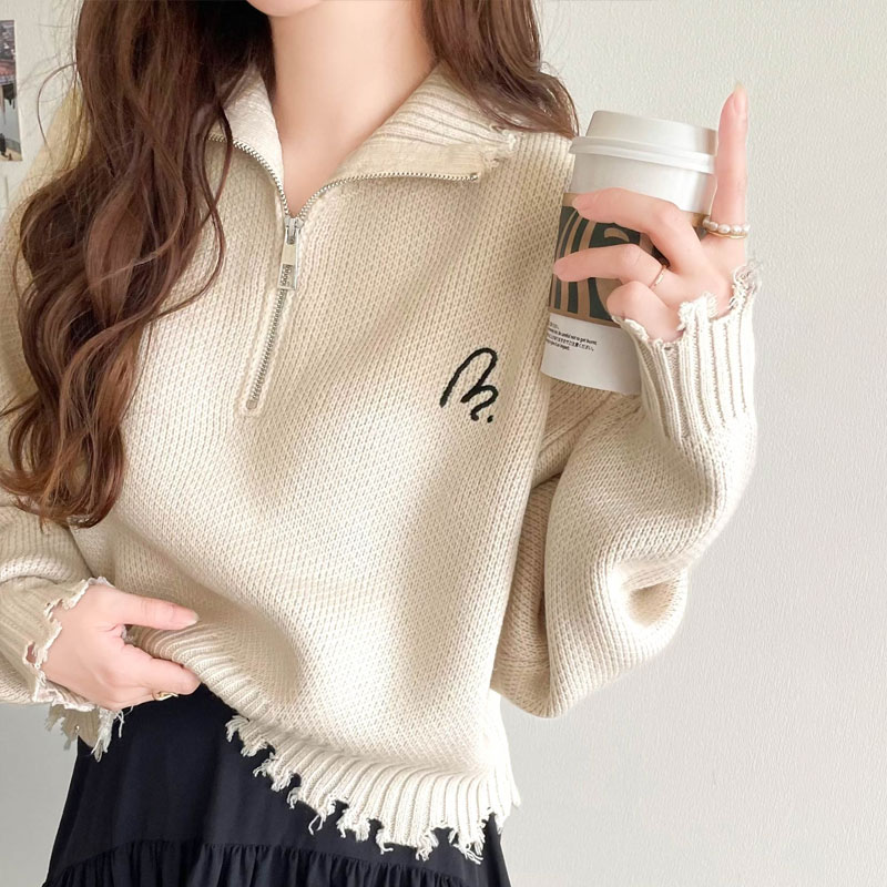 ハーフジップニット🤍胸の刺繍が可愛い🫶ジップを閉じてハイネック風にも◎ 🏠 【