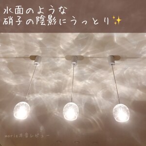 電気をつけると天井いっぱいに水面のような陰影が浮かび上がるペンダントライト🦢✨好きすぎてペンダントタイプをダイニングに3灯、ブラケットタイプを階段に設置しました。下の子、抱っこすると手を伸ばして照明をタッチ、光がユラユラするのを楽しんでます。 ◎ 光と影の雰囲気が堪りません。写真では伝えきれない! ◎日中、明かりをつけていない時も、ガラスの凹凸が美しくていい感じです。 ◎ガラスの質感が好きな方にはおすすめ!入居後5年経ちましたが今でも毎日見ると気分が上がる一品です