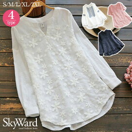 【0】【即納】 刺繍ブラウス トップス レディース リネン風 リネンタッチ レース 半袖 長袖 花柄 大きいサイズ 切り替え シャツ カジュアル 送料無料 春 夏【 花柄刺繍プルオーバーブラウス 】
