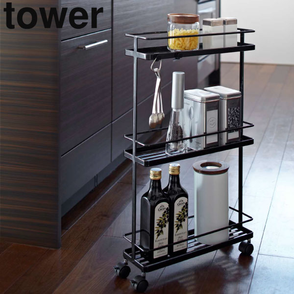 "Slim Kitchen Cart TOWER" キッチンのちょっとした隙間にもぴったり収まる、TOWERのスリムキッチンワゴンです。キャスターが付いているので、移動がとてもスムーズ。しかも、キャスターにはロック機能も付いているので、収納したい時にはしっかりと固定することができます。よく使う調理器具などをかけるための取り外し可能なフックも付いているので、調理の効率もアップします。調味料や調理道具など、キッチンに必要なものを一通りまとめて収納できるので、キッチンをすっきりと整えたい方におすすめです。