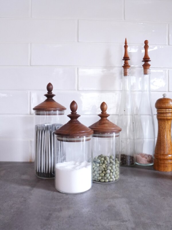 【キャニスター】 木のフタがとにかくオシャレな 耐熱ガラスキャニスター 愛用しています お菓子やコーヒー豆 サプリ、お塩入れたりと あると便利です フタにはシリコンパッキンがついていて しっかり密閉出来て機能面も満足しています。