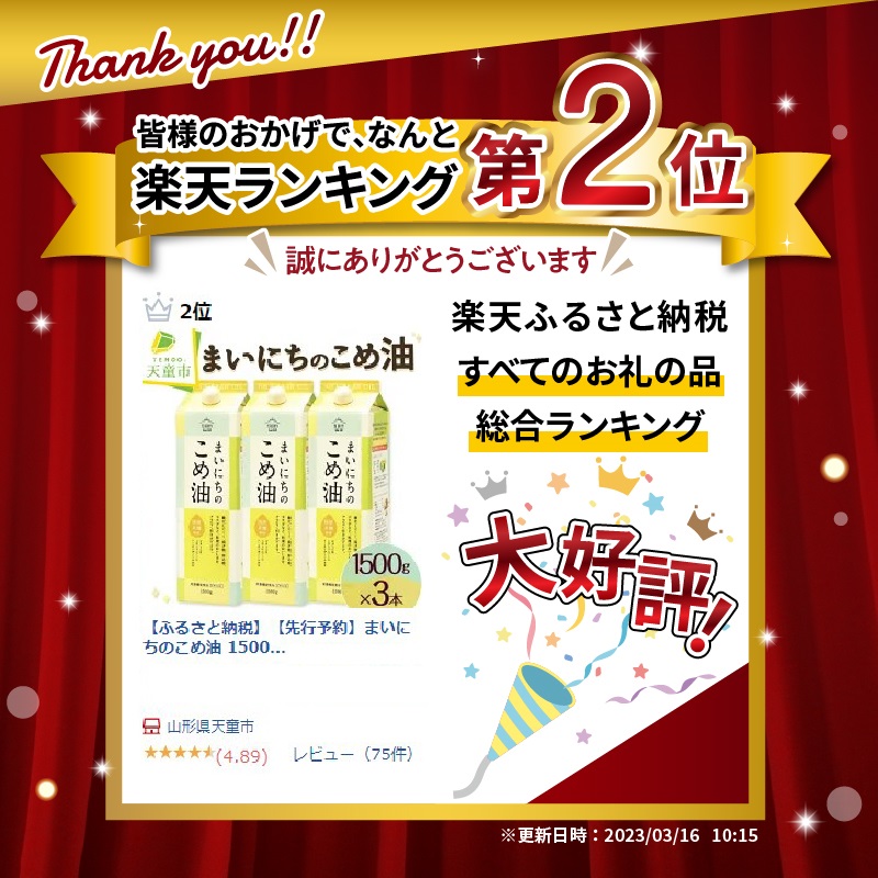 【ふるさと納税】【先行予約】 まいにちのこめ油 1500g × 3本 セット 配送時期が選べる 発送時期が選べる 大容量 国産 紙パック 米油 こめ油 こめあぶら 植物油 食用油 調味料 ご家庭用 のし 贈答 ギフト 先行予約 お取り寄せ 健康志向 レビュー高評価 【 山形県 天童市 】
