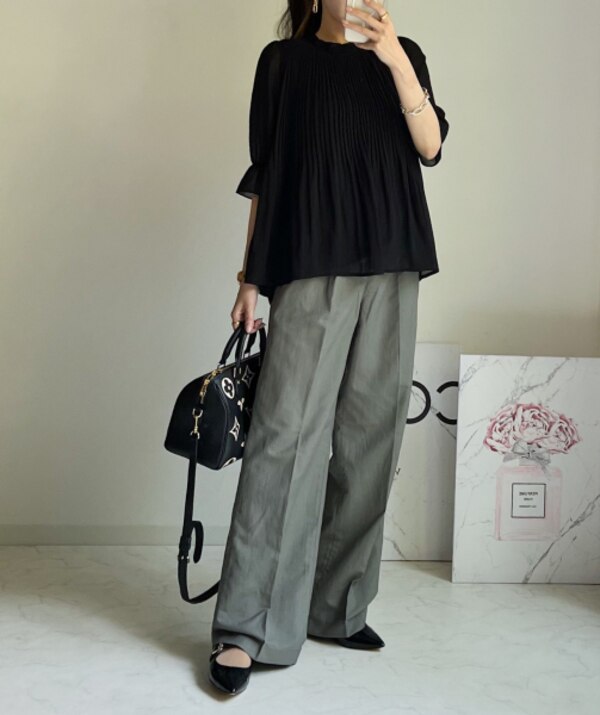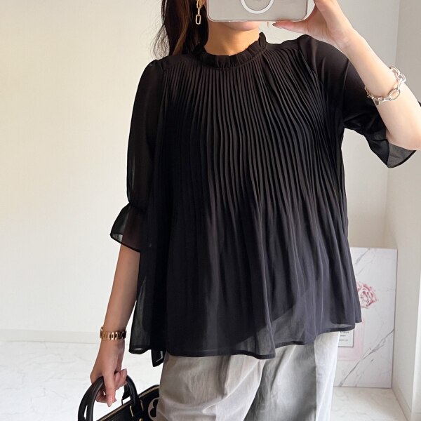 mukuさんの シフォンプリーツブラウス! シンプルなコーデが好きですが 何年もコーデしていて気付いたのは やはり、シンプルだけれど どこかポイントになるトップスを着た方が 簡単におしゃれに見えるということ👀 mukuさんのこちらのトップスは まさに簡単にコーデを おしゃれ見えさせてくれます ギャザー&フレアで 華やかさあり、でも派手ではなく ちょうど良いバランス( ᷇࿀ ᷆ ) いつものパンツに合わせるだけで グッと雰囲気が出ると思います😊 お腹周りや二の腕も隠せるので 体型カバーにも良いです! ふわふわの生地が 少し甘めのデザインとマッチして プチプラだけど、めっちゃ使える! 49%OFFクーポン出ています! クーポンは商品ページから取得出来ます ブラック 半袖着用 4560円→2326円送料無料