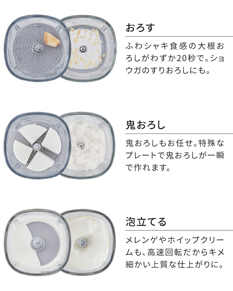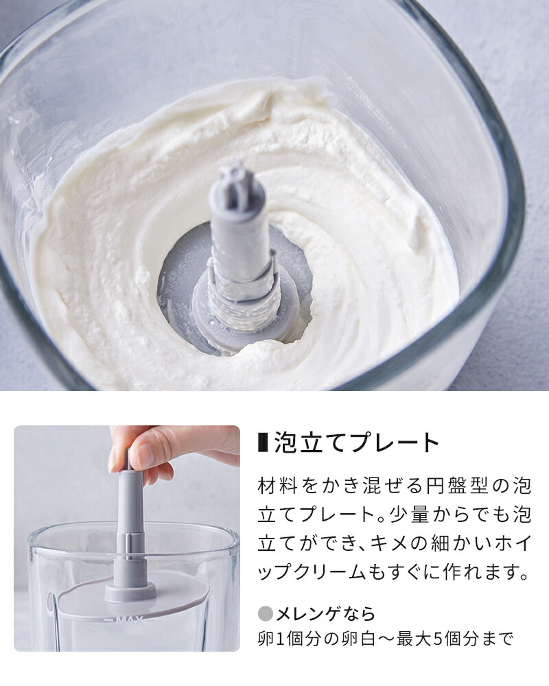 「泡立て」「混ぜる」「こねる」がこれ1台で。お菓子作りにはもちろん、ピザやパンの生地つくりなど様々なお料理に活躍します。AC電源+ダブルアタッチメントでとてもパワフルです。