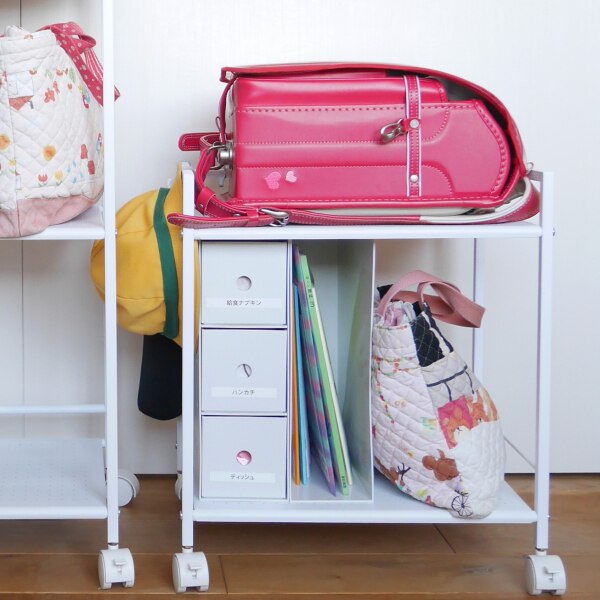 ランドセル収納におすすめ🎒✨上段にランドセル、下段に教科書や手さげなど、また、サイドのバーにフックを付ければ、水筒カバーや通学帽などを吊り下げることができます😊キャスター付きだから移動も楽々♪