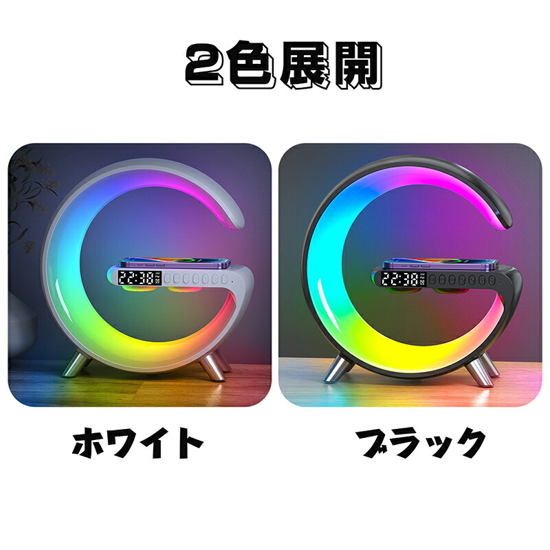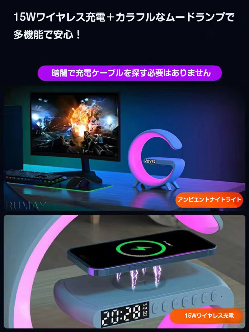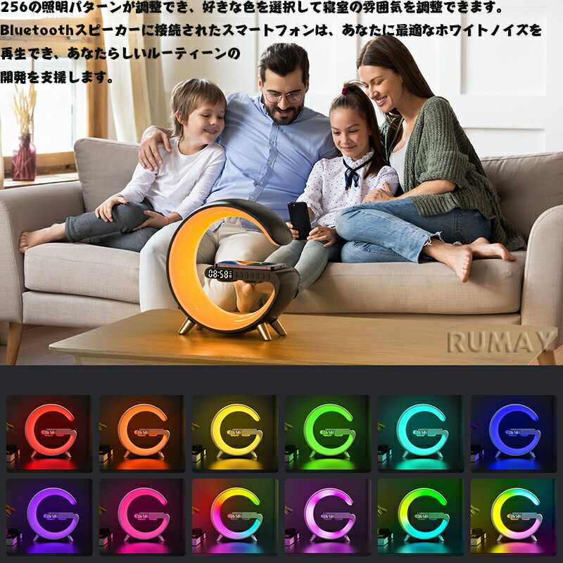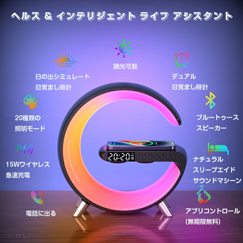 数量限定レビュー特典 楽天1位 あす楽対応】RUMAY ブルートゥース スピーカー ワイヤレス充電器 スマート 目覚まし時計 ナイトライト4in1 雰囲気ランプ インテリジェントLEDテーブルランプ 音楽同期 装飾用のアプリ制御 日本語説明書付き 即納