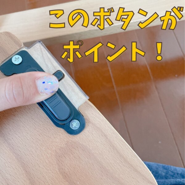 今まで使ってたハイチェアなんて、子どもが成長するたびにドライバーを持ってきて、椅子を倒してガチャガチャいじってたんだけど、これならボタンを押しながらスライドするだけ!