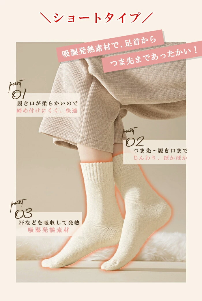 🎉「履いた瞬間、足元からふわっと包まれる心地よさ!」🎉 このソックスは、発熱と保温に優れた素材を使い、足先からふくらはぎまでじんわり温かさを感じられる靴下です。アクリルと毛を含む柔らかな生地が特徴で、ふんわりした風合いがより快適さを高めます。 冷えが気になる室内での家事やデスクワーク、リラックスタイムに使うと、足元のぬくもりが長く続きます。ハイソックスタイプなので、足首をしっかり覆って温度を逃しにくい点も魅力です。 例えば、夕方、冷えたリビングのフローリングに足をついて家事をするとき。サッとこのソックスを履くと、足首からふくらはぎまでじんわり暖かさが広がります。テレワーク中に足元がひんやりして集中できない時にも、これを履けば自然とパソコン作業に没頭できます。🧦✨ カラーはモカブラウンやアクアグラスなど全9色で、気分に合わせて選べます。生地が引っかかりやすいため、着用時は爪や家具との摩擦に注意するときれいな状態を保ちやすいです。