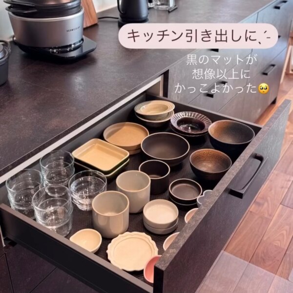 ブラックとクリアを購入ˎˊ˗ ブラックは想像以上にかっこよくなって 引き出し開けた時の テンションが変わります🥺🌸 我が家は陶器、土器中心なので 滑り止め効果もバッチリ◎ 軽いプラ製品は かなり強めに引き出すと 少しズレるかもです! (ペットボトルの蓋でためしました🥹) 引き出しが綺麗に保てるのも良かったです☺️!