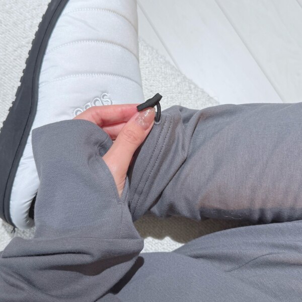 ゆったりシルエットで寝返りもしやすくて、指穴と調整ストッパーつき(ストッパーまで柔らかい🥺)で、季節の変わり目もこわくない!