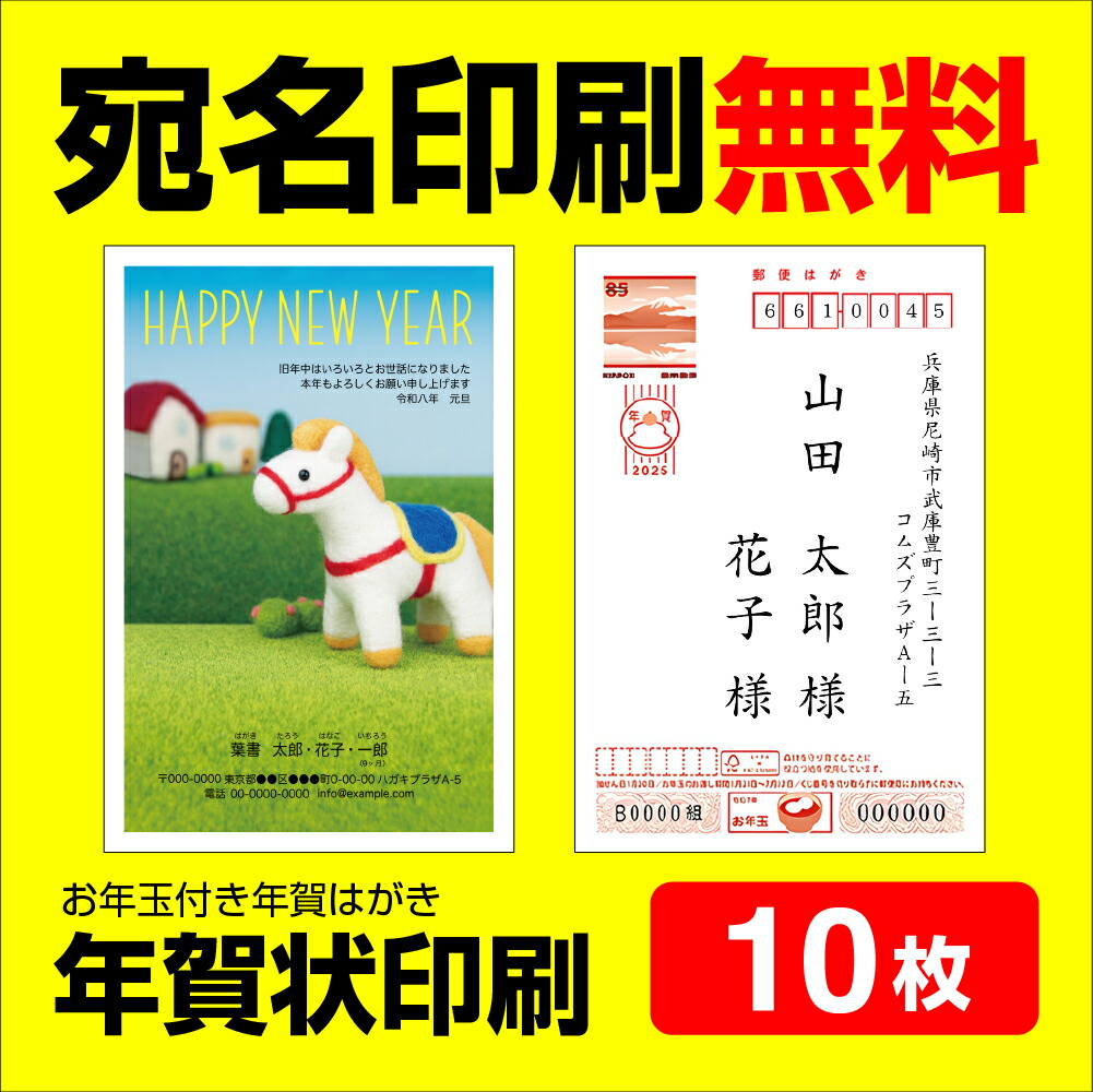 年賀状印刷 宛名印刷無料 10枚 年賀状 年賀状じまいにも対応 2026 お年玉 くじ付き 挨拶文変更可能 自由編集 年賀状印刷 年賀はがき 年賀ハガキ スタンプ 午年 法人