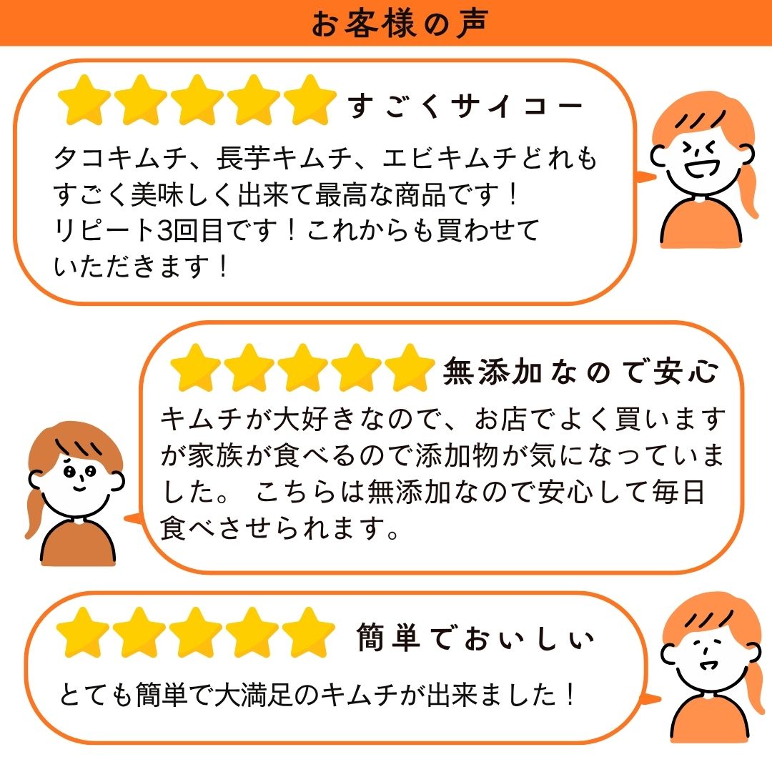 何がすごいかって「無添加」なこと!保存料も着色料も増粘剤も使ってません。売られているキムチって意外と添加物が多いんですよね、健康のためにキムチを食べようとしているのになんだか本末転倒な気がしていたところ、キムチ革命なら自宅で好きなお野菜を好きな分量だけ漬ける事が出来ます!
