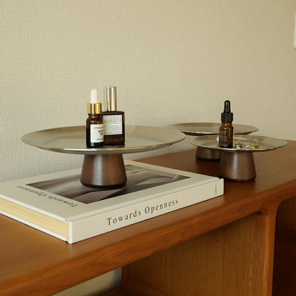 ステンレスとウッドという異なる素材が織りなす美しいコントラストが魅力の脚付きアクセサリートレイ🍂モダンで洗練されたデザインは、置くだけで空間をスタイリッシュに演出~