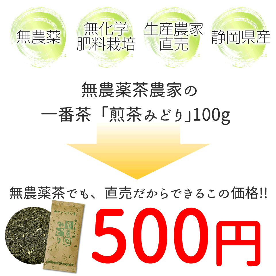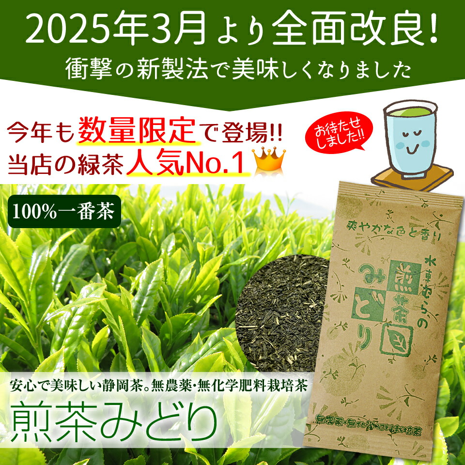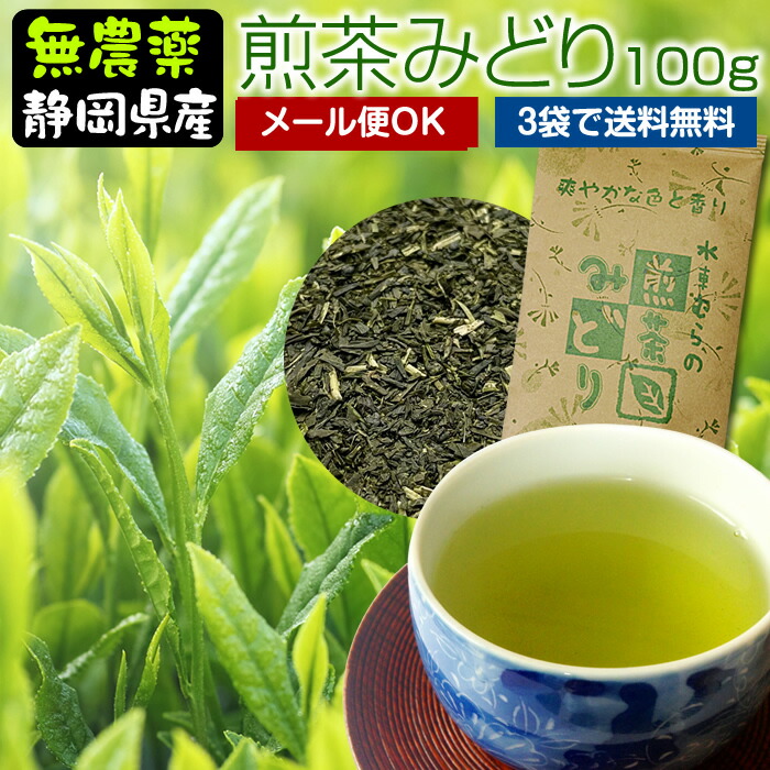 新製法でリニューアル煎茶みどり100g 無農薬・無化学肥料栽培【無添加】【静岡産】【通販】よりどり3袋ごとメール便にて送料無料対象商品