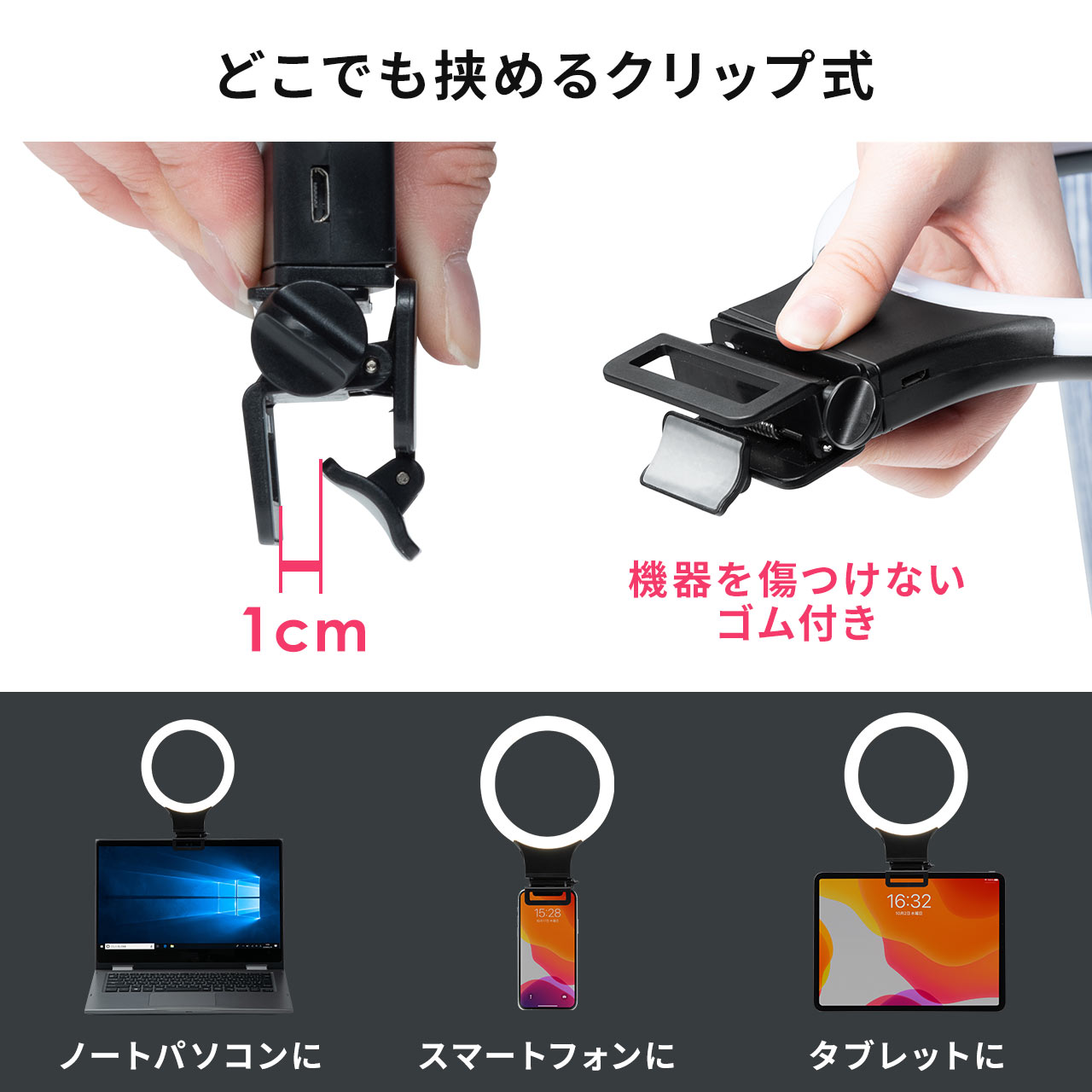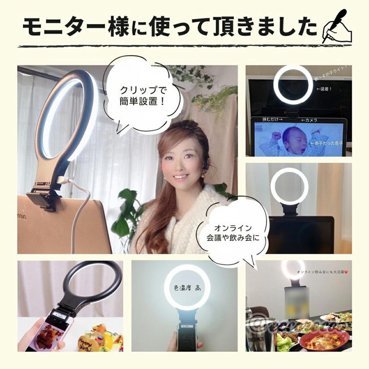 クリップでスマホにもタブレットにもパソコンにも設置可能!リングライトで顔が明るくなるね!