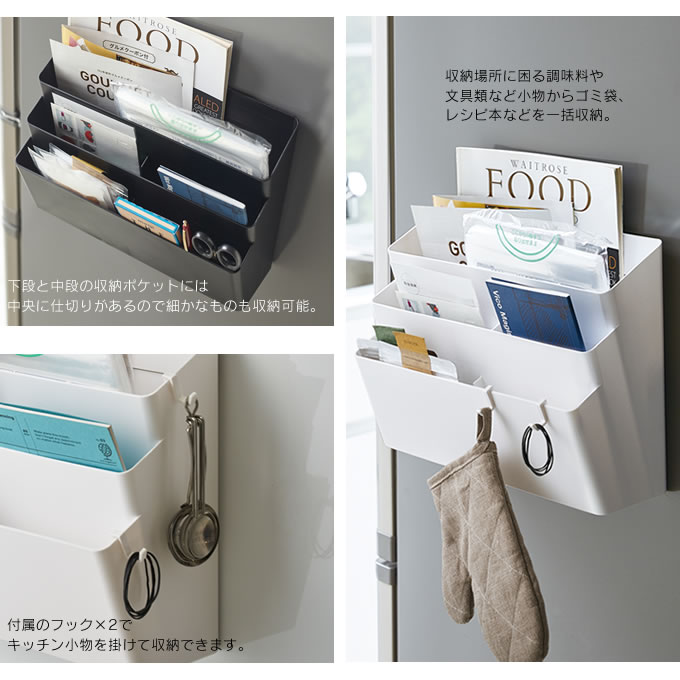 tower 冷蔵庫横マグネット収納ポケット 3段 タワー / 冷蔵庫 マグネット ピタッと ファイル 収納 省スペース 山崎実業 白 ホワイト 黒 ブラック 収納ケース 収納ポケット ウォールケース ウォールポケット レシピ プリント yamazaki
