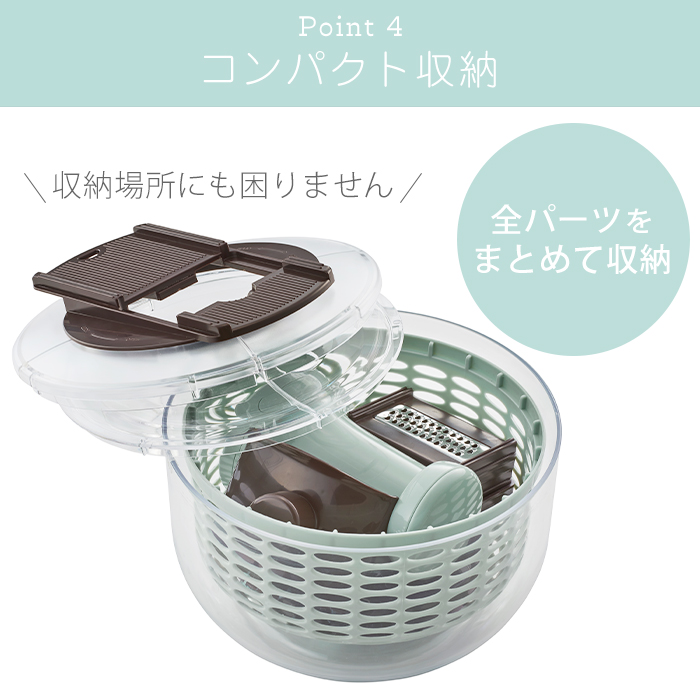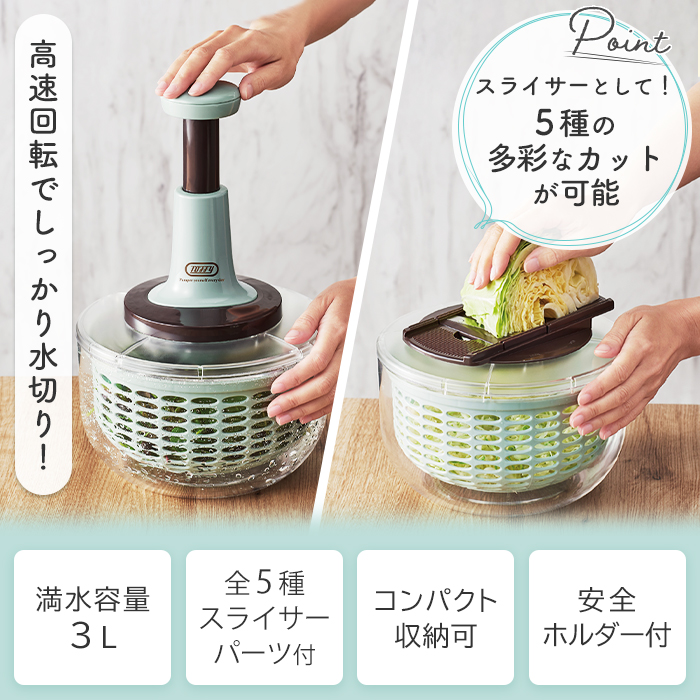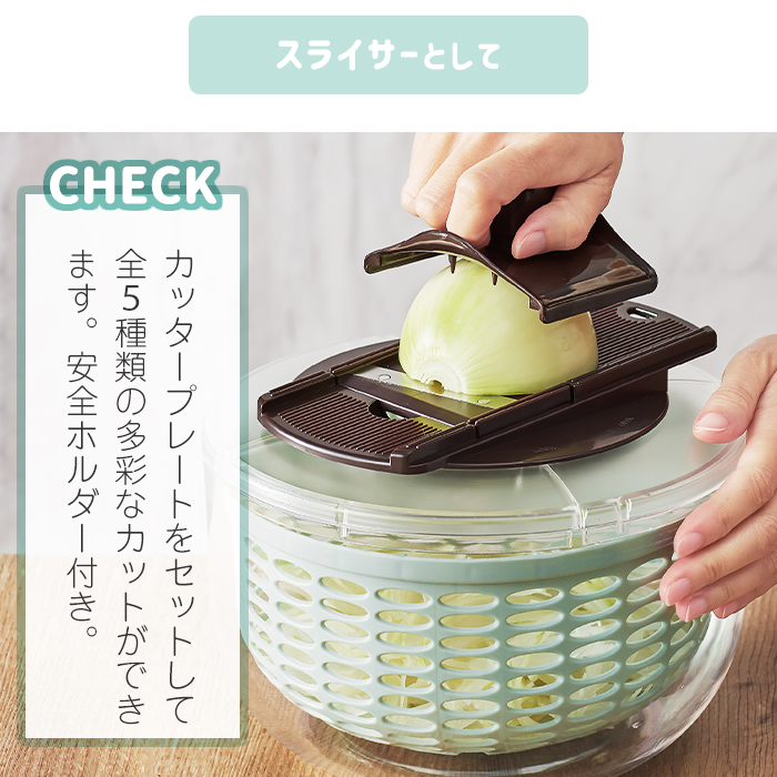 サラダスピナーとスライサーがドッキング!!これでサラダ作りがすごくやりやすくなるね!